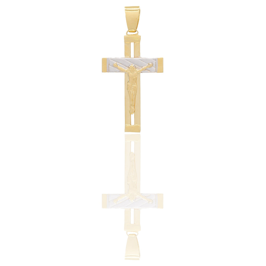 Ciondolo in oro BICOLORE Oro 18 carati Croce con Cristo traforata rigata Solo oro 3.9 cm x 1,9cm Gr. 3,35