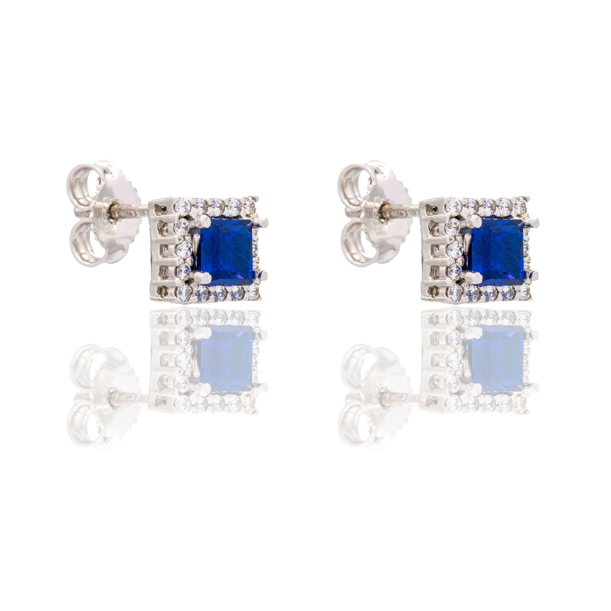 Orecchini in oro BIANCO Oro 18 carati Quadrato Con Contorno Zirconi Bianchi, Zircone Blu Gr. 2,15
