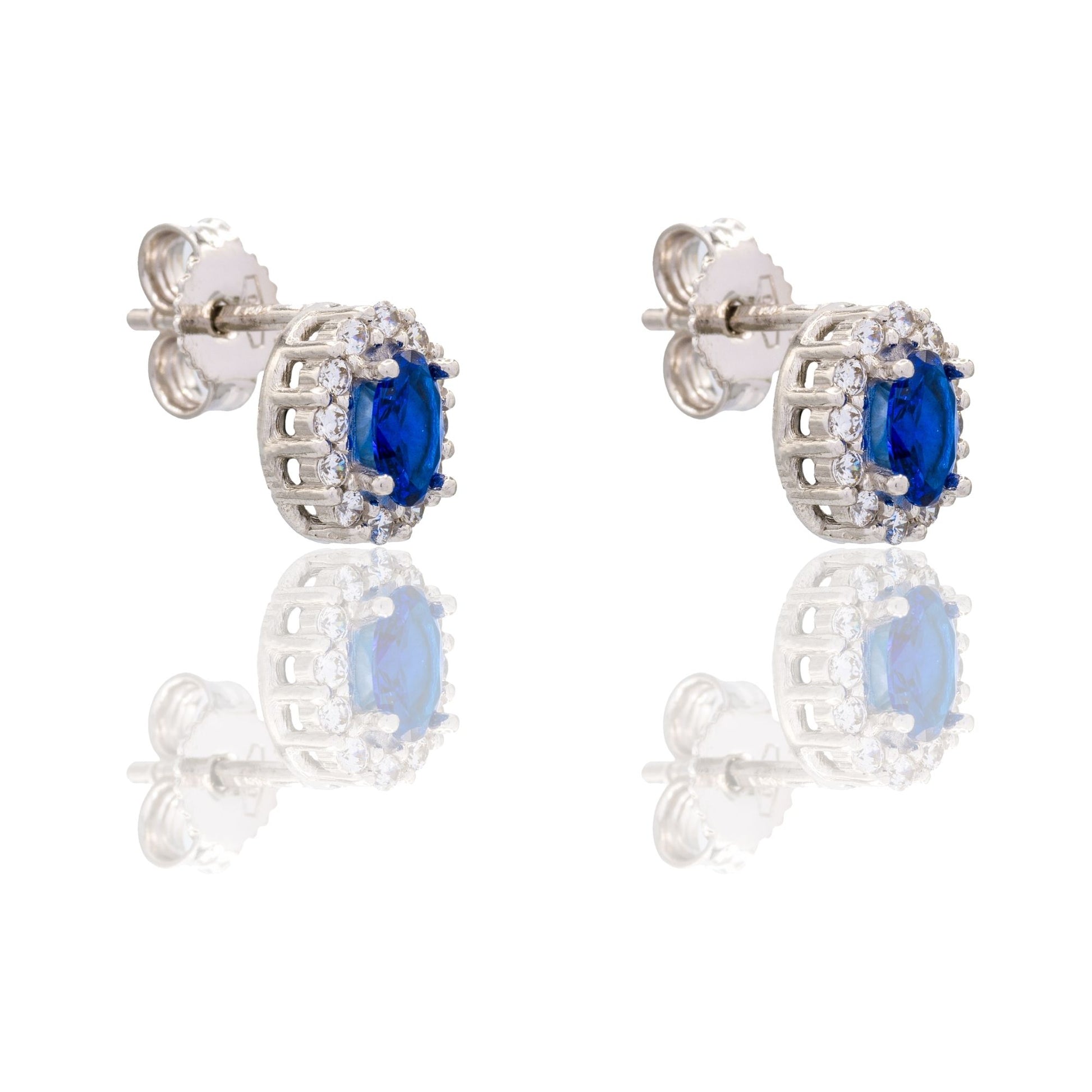 Orecchini in oro BIANCO Oro 18 carati Ovale Con Contorno Zircone Blu, Zirconi Bianchi Gr. 2,15