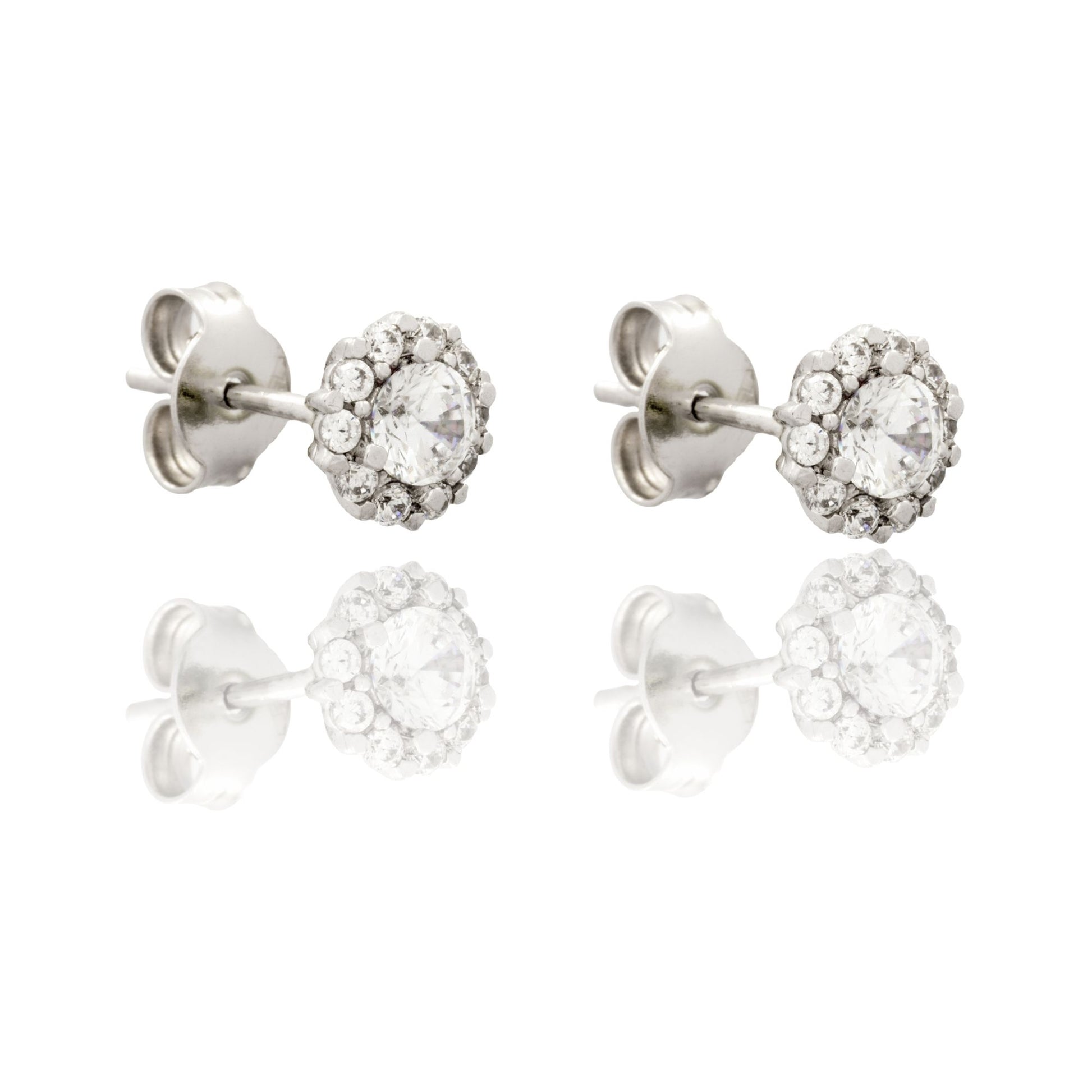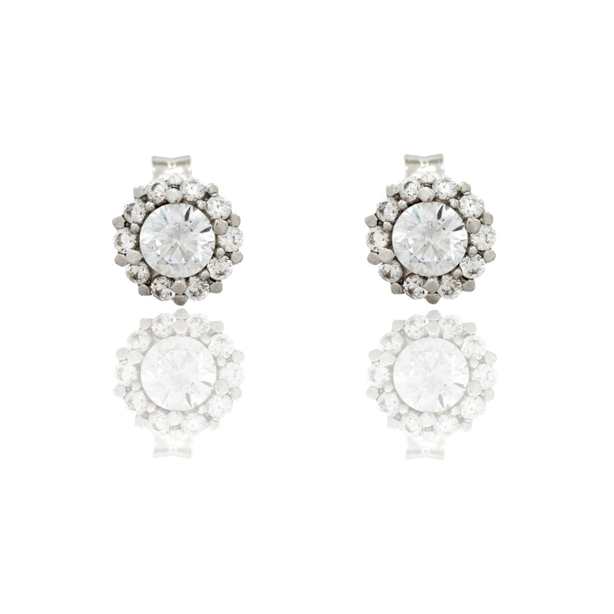 Orecchini in oro BIANCO Oro 18 carati Tondo A Lobo Centro E Contorno Zirconi Bianchi Gr. 2,1