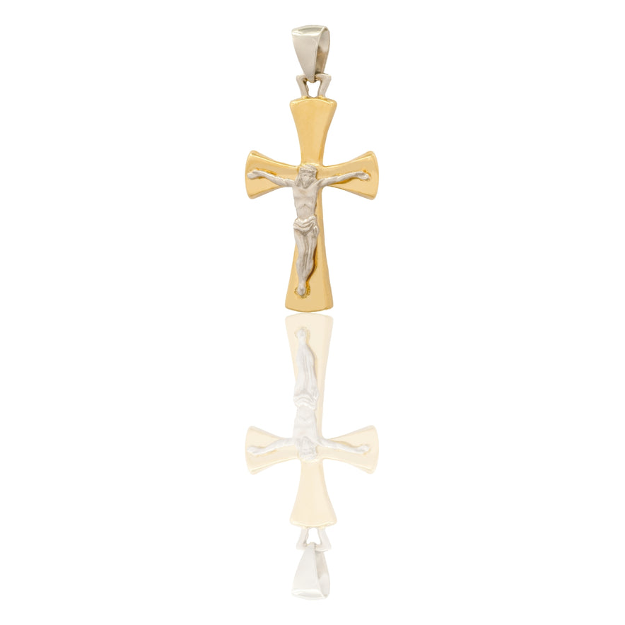 Ciondolo in oro BICOLORE Oro 18 carati Croce Con Cristo Punte A Ventaglio Solo Oro Gr. 2,35