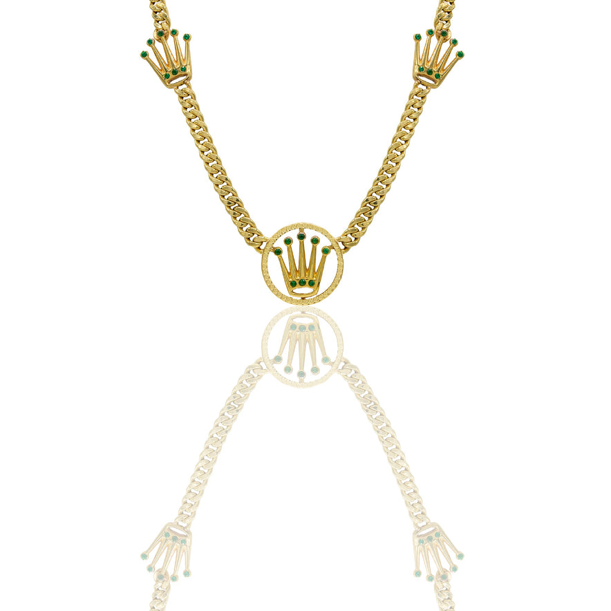 Collana in oro GIALLO Oro 18 carati Groumette con cerchio e Corone Zirconi Verdi lunghezza cm. 65,00 Cerchio diam. 3,00 Gr. 25,95