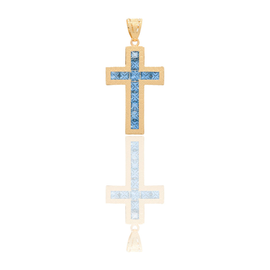 Ciondolo in oro GIALLO Oro 18 carati Croce diamantata Zirconi Azzurri 4,5cm x 2,3cm Gr. 4,85