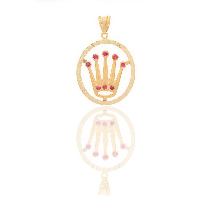 Ciondolo in oro GIALLO Oro 18 carati Tondo traforato con corona Zirconi rosa 4,5cm x 3cm Gr. 4,05