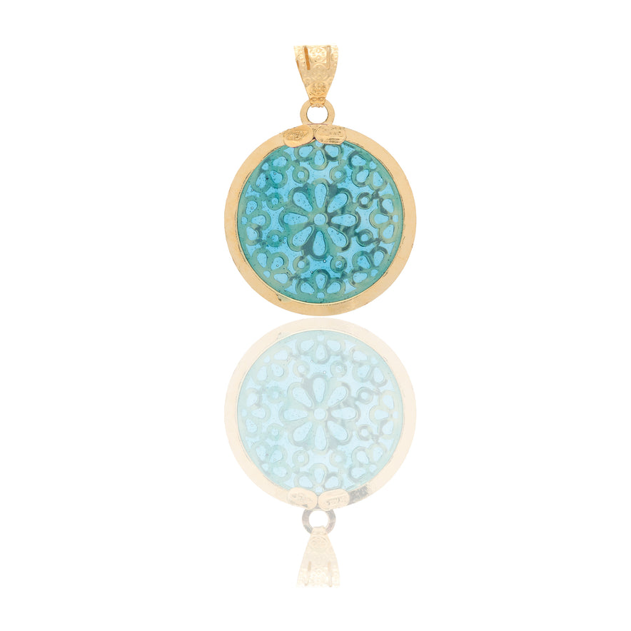 Ciondolo in oro GIALLO Oro 18 carati Tondo con fiori Smalto blu 3cm x 2,2cm Gr. 1,1